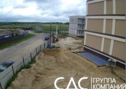 На площадке дома № 1 (I очередь) продолжаются работы по разводке сетей водопровода и теплоснабжения, благоустройству территорий, установке ограждений на балконах.