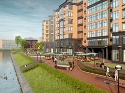 Жилой комплекс Ostrov представляет собой один корпус, создающий закрытый от посторонних уютный двор. |